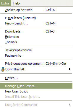 3e: Ga nu naar het menu 'Extra' (Engels: 'Tools') en klik op 'Manage User Scripts' (afbeelding).