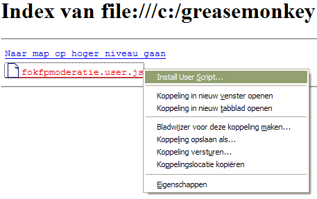 3c: Klik met je rechtermuisknop op fokfpmoderatie.user.js en kies voor 'Install User Script' (afbeelding).