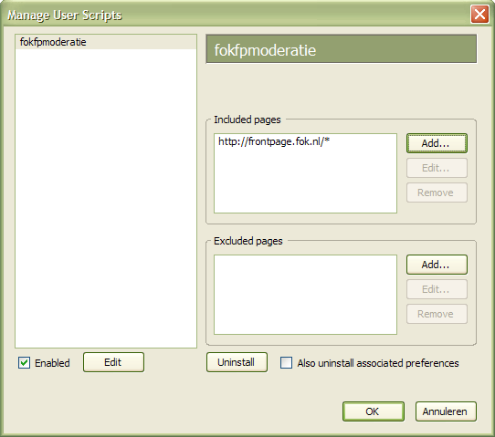 3f: Je gaat nu aangeven na het laden van welke pagina's het script moet worden uitgevoerd, klik daarvoor bij 'Included pages' op 'Add' en vul in: 'http://frontpage.fok.nl/*', zonder de ' uiteraard (afbeelding).